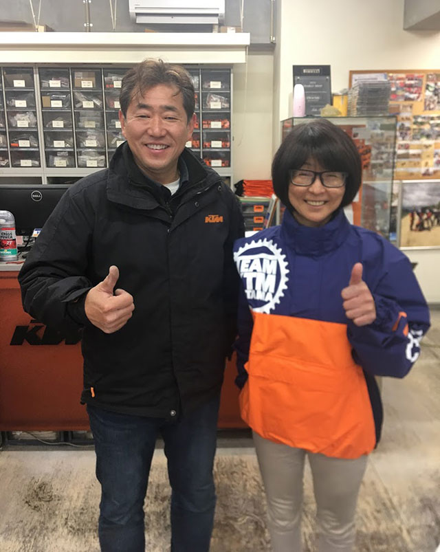 という古宅さんの言葉に、私もKTM埼玉ファミリーの末席になんとしても加わりたくなり、埼玉さんのオリジナルウエアを思わず購入し、その場で記念撮影。笑