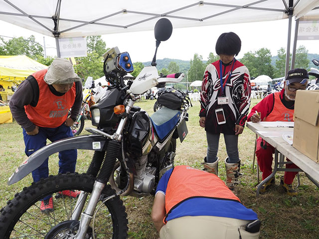 車検の順番を待つ菅原会長、マシンはセロー250です。